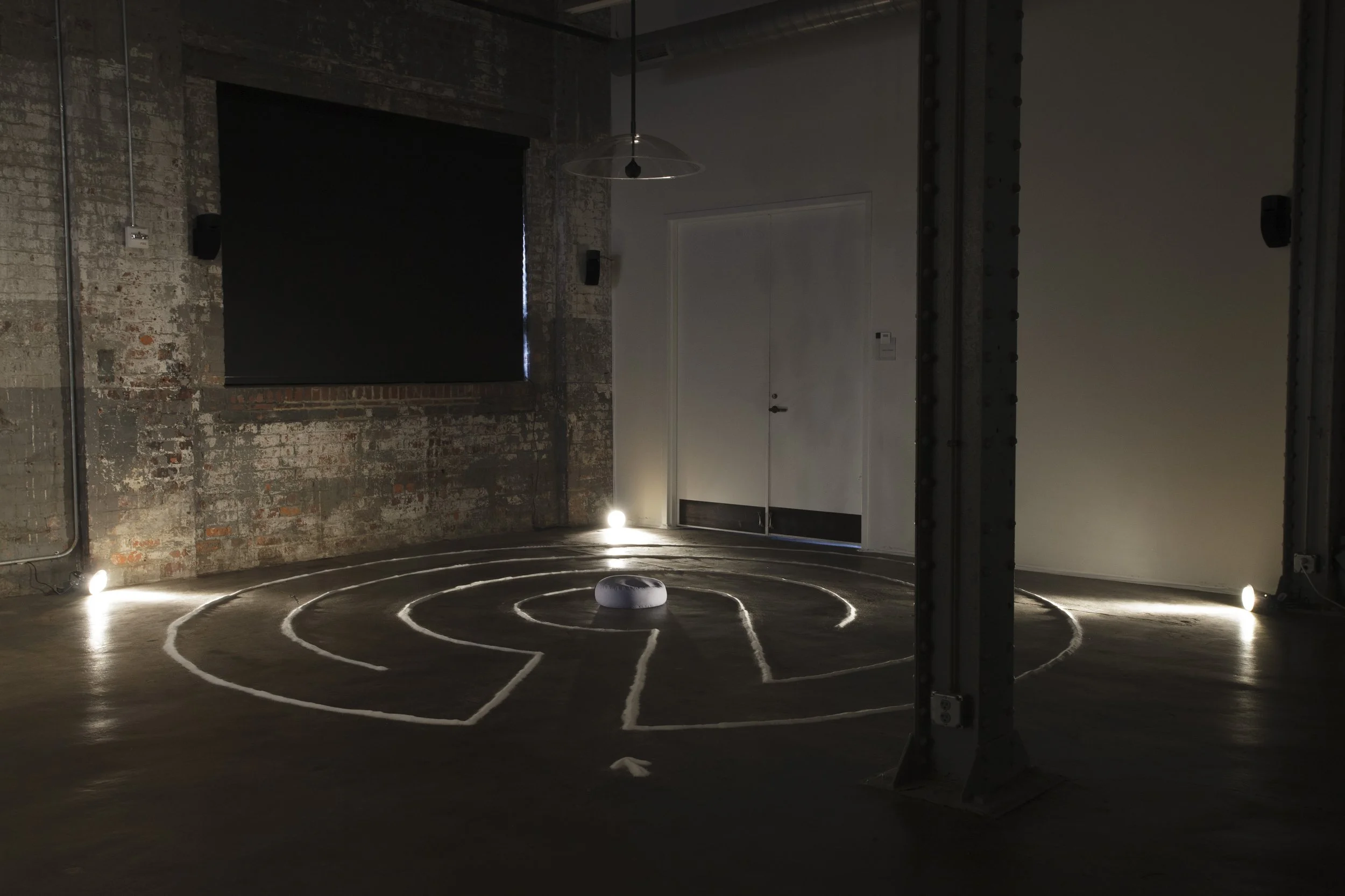 Salt, 5 channel sound (4 channel surround and 1 channel directed audio via parabolic speaker), household items recorded via contact microphones, parabolic speaker, recorded dialogue.